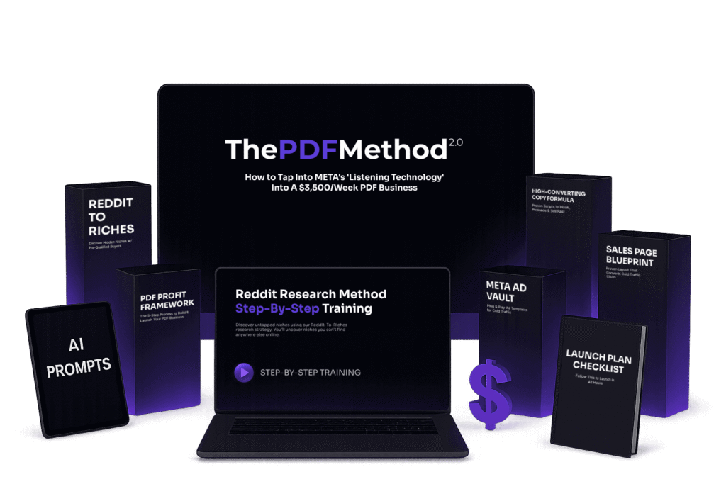 The complete PDF Method 2.0 system – all 8 modules, templates, AI prompts, everything you need to start making money with digital PDF guides – for just $27.